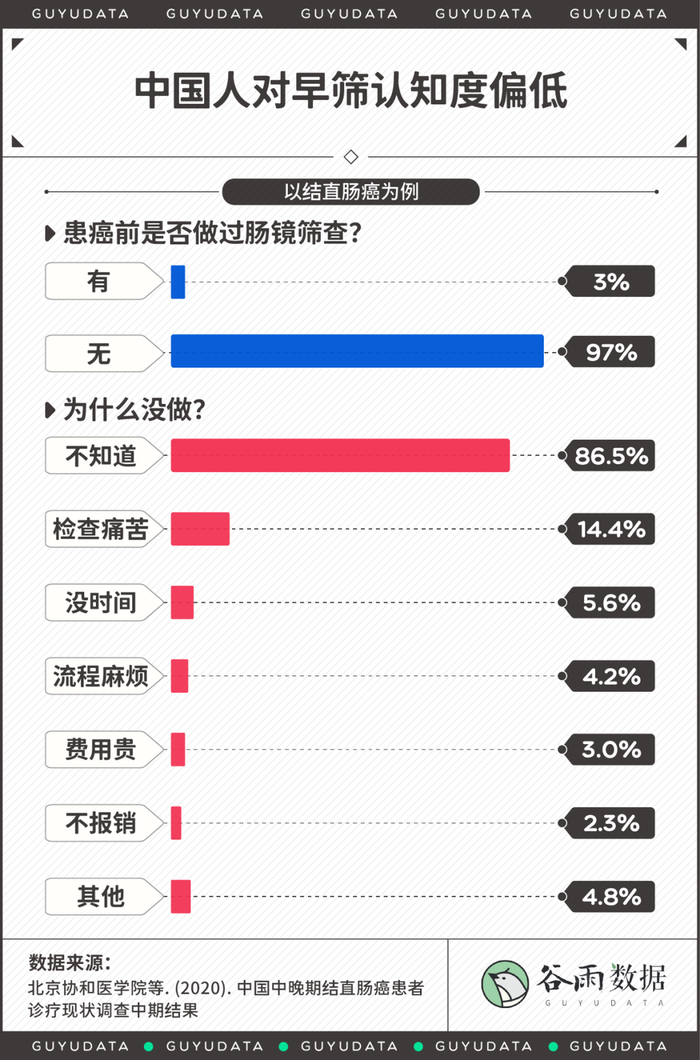 以结直肠癌为例,根据北京协和医学院等机构公布的一项统计,在所调研的肠癌患者中,有97%的人在患病前从未做过肠镜筛查。