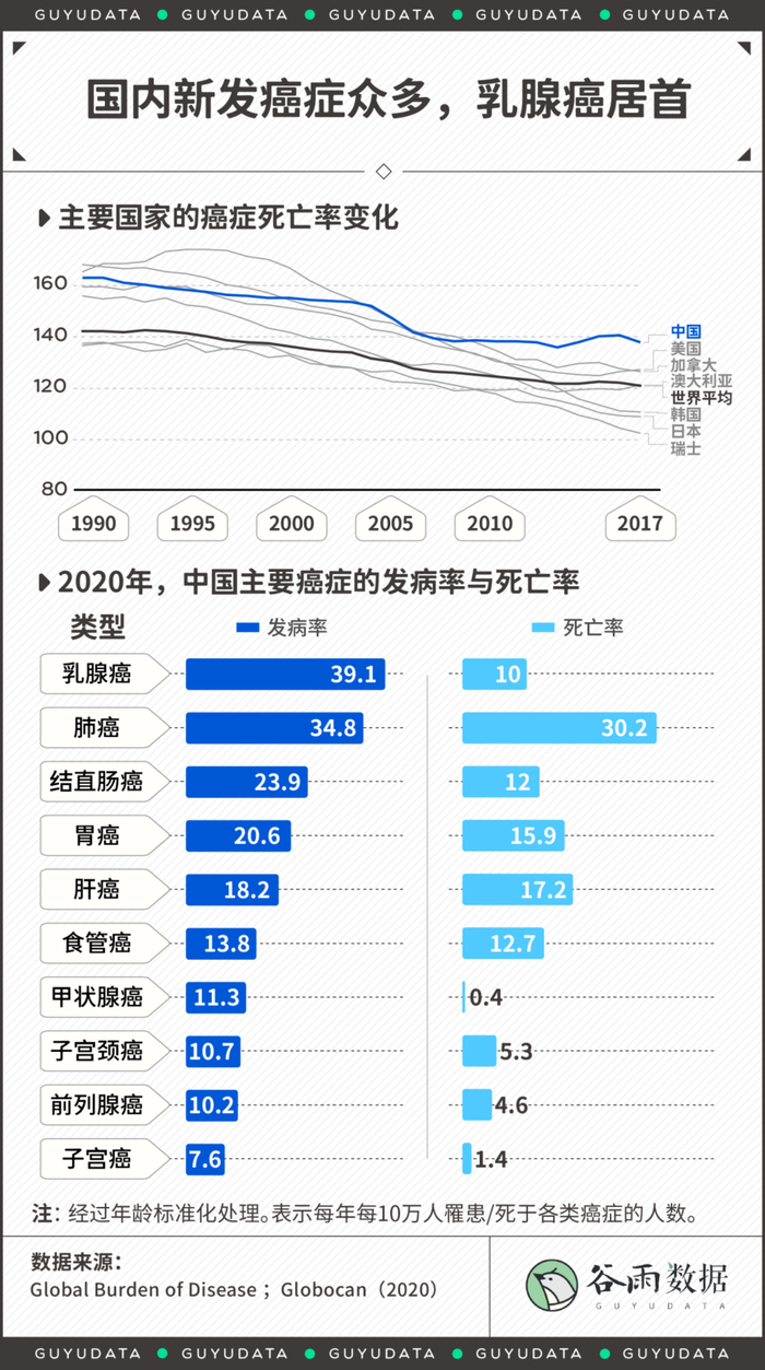 2020年,中国发病率最高的癌症中,乳腺癌、肺癌、结直肠癌、胃癌与肝癌位列前五。