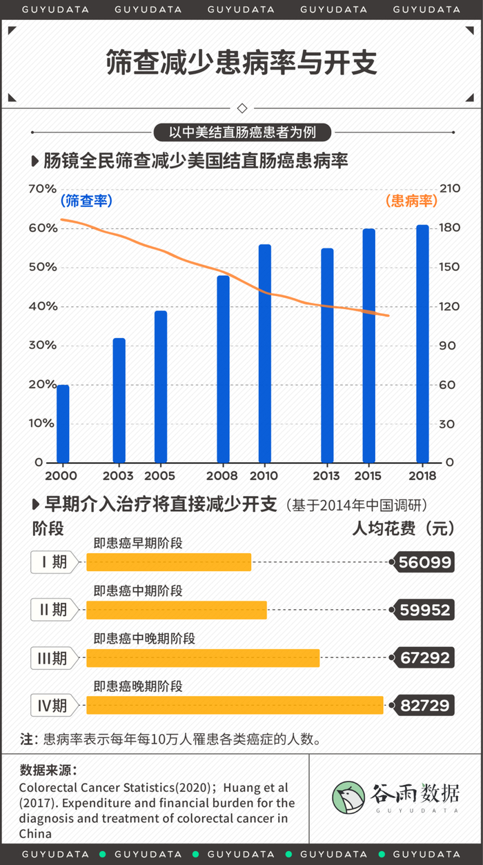 以结直肠癌为例,美国的肠镜普及率由2000年的20%增长至2018年的61%,归功于肠镜医疗保险覆盖人群的扩大。在此期间,结直肠癌的患病率呈稳定的下降趋势。