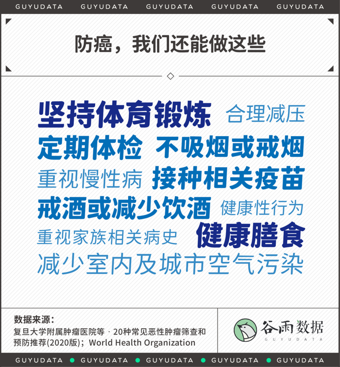 面对“患癌焦虑”,复旦大学附属肿瘤医院等机构联合编发的《20种常见恶性肿瘤筛查和预防推荐》,以及世界卫生组织的癌症防控意见都给了我们这些建议: