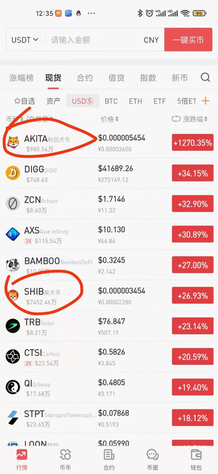 当然,包括秋田犬币(AKITA)、柴犬币(SHIB)、宠物币(PET)在内的一系列带有“动物名字”的山寨币也在狗狗币史无前例的上涨声浪中起舞。其中,秋田犬币的日内涨幅一度超过1000%。