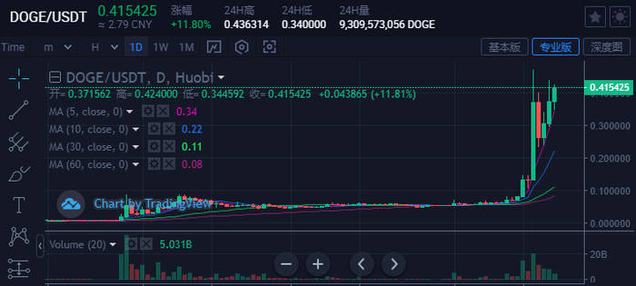2021年4月16日,狗狗币在当天币价最高上探至0.47美元/枚,日内暴涨超200%,年内价格暴涨超100倍,仅耗时106天!而市值也一度突破500亿美元,位列加密货币市值第五位。