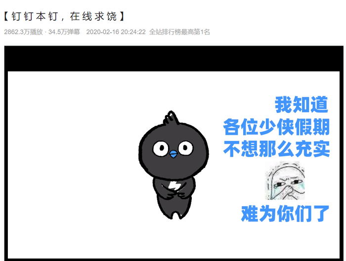 一个是钉钉的《钉钉本钉,在线求饶》视频,准确抓住了年轻用户因为上网课对钉钉产生的不满情绪,并用“鬼畜音乐调侃求饶”这种方式与年轻用户实现了良性沟通。这则视频目前累计播放高达2862.3万。