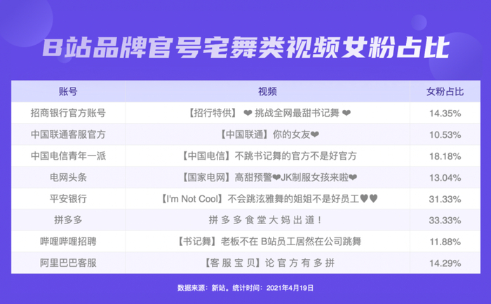 用户画像方面,新站数据统计了“中国联通客服官方”“招商银行官方账号”“中国电信青年一派”等官号高热度宅舞视频的用户画像。