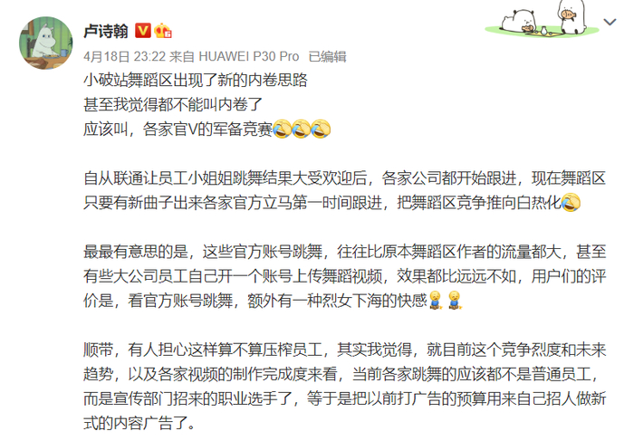 联通、电网这些传统品牌们靠宅舞吸引年轻人,感觉上有点像努力跟你找话题的家长、老师,虽然感人,但还是有一丢丢违和。卢诗翰的说法就更加微妙了:“看官方账号跳舞,额外有一种烈女下海的快感。”