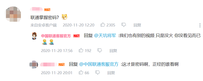 就连联通小编都在线“气愤”吐槽,觉得自己的其他视频没人看。可惜网友马上“正经”回击:“这才是密码啊,正经的谁看啊”。