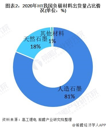 从我国负极材料消费结构来看,人造石墨消费比重最大,2020年上半年,我国人造石墨出货量达81%。