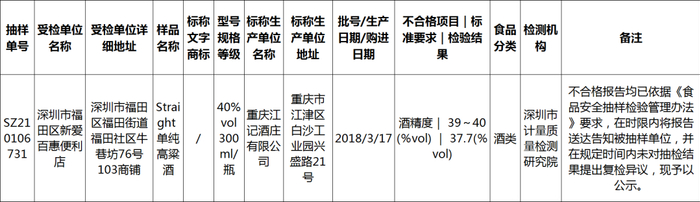 通报显示,标称重庆江记酒庄有限公司生产的、深圳市福田区新爱百惠便利店销售的Straight 单纯高粱酒(40%vol 300ml/瓶、2018-03-17)酒精度不合格,标准要求为39~40 (%vol),检验结果为37.7(%vol) 。