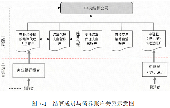 中央结算公司根据机构性质及其业务范围对账户实行分类设置、集中管理。机构投资者直接在中央结算公司开立一级债券账户,分为债券自营账户和债券代理总账户。其中,债券自营账户用以记载债券持有人自营债券余额及其变动情况,结算代理人、直接交易结算、委托结算代理人成员均应在中央结算公司开立债券自营账户。债券代理总账户用以记载二级托管机构和分托管机构所托管的债券余额及其变动情况,二级托管机构和分托管机构应在中央结算公司开立债券代理总账户。结算成员与相关债券账户关系如下图所示: