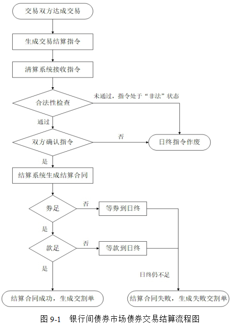3. 清算与交割。交易达成后,交易双方通过中央结算公司中债综合业务平台完成后台债券与资金的清算交割。债券结算业务的全过程从结算双方发送结算指令开始,到最后完成债券与资金的交收,其基本流程如下:
