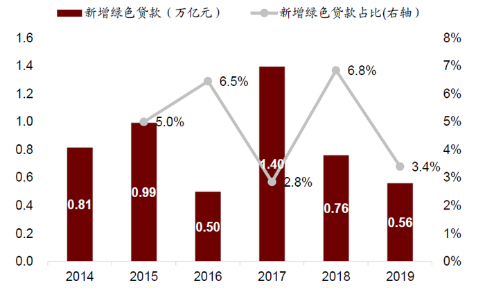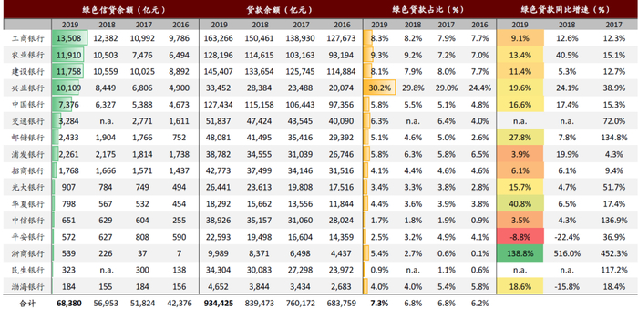 注:兴业银行数据为绿色金融融资余额,而非绿色信贷数据;资料来源: 公司公告,中国人民银行,万得资讯,中金公司研究部