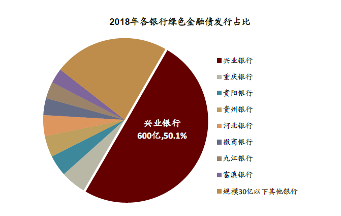 图表:2018年兴业银行绿色金融债发行占比过半;2019年国开行发行量最大,兴业银行保持高位。