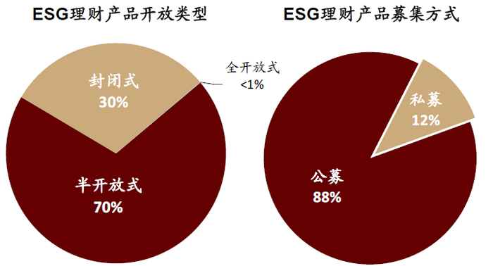根据实际募集规模加权后,2019-2020年62种ESG理财产品中,半开放式ESG产品占比最高,达70%。募集方式上,ESG理财产品以公募为主,占比高达88%。8成ESG产品投资组合偏向固定收益类产品,权益配置较低。2019-2020年有近4成理财产品归属银行理财子公司管理。