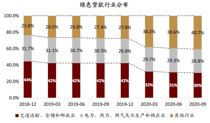 图表:按用途划分,其他行业绿色信贷占比从2018年末的24%提升到3Q20末的41% VS 绿色投融资需求结构