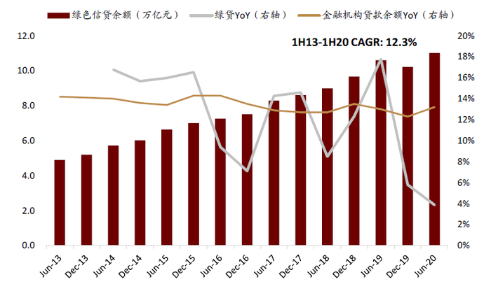 2020年末绿色信贷投放规模超12万亿元,但增速可能已迈入平台期。按照2018年《中国人民银行关于建立绿色贷款专项统计制度的通知》的统计口径看,近年来国内绿色信贷规模稳步提升。全国银行业金融机构绿色贷款余额已从2013年6月末的4.90万亿元增长至1H20末的11.01万亿元,年均复合增长率达12.3%。尽管CAGR较高,但近几年绿色信贷余额同比增速(1H20末为3.9%)不及整体金融机构贷款余额增速(1H20末为13%)。2019年,新增绿色贷款占全部新增人民币贷款3.4%,该占比较2018年的6.8%有所回落。我们判断绿色信贷在经过2013-2015年间高速发展后迈入平台期,亟需多方协调,通过有效的政策补贴/市场化激励机制、绿色信贷项目收益率提升以及绿色金融工具的多元化来合力推动建设国内绿色金融体系。