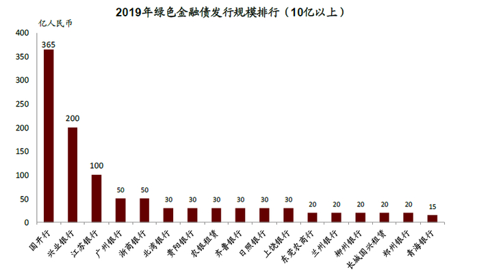 各银行发行绿色金融债规模差距较为悬殊,发行份额向头部集中。兴业银行2018年发行份额占比高达50.1%,超过其他银行发行量总和。2019年国开行绿色金融债发行规模达到365亿元,超过兴业银行的200亿元发行规模排行第一,但发行份额仍然集中于少数头部银行。