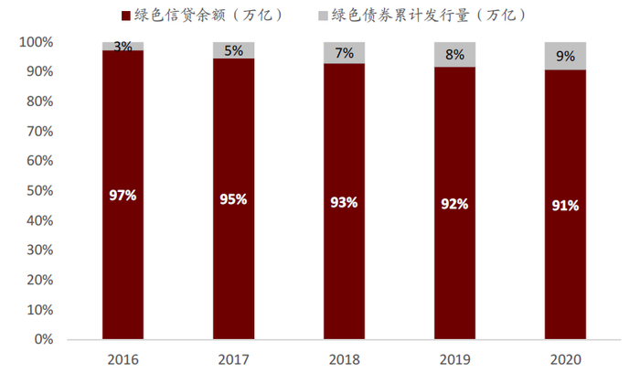 图表:绿色融资以绿色信贷为主,绿色信贷余额占总融资额的91%