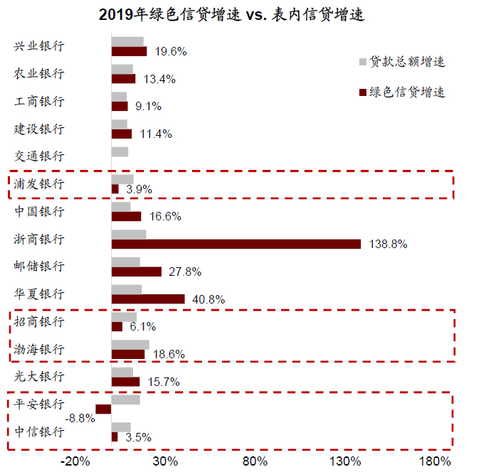 图表:大部分银行绿色信贷增速高于表内信贷增速,除了平安、浦发、中信、招行和渤海