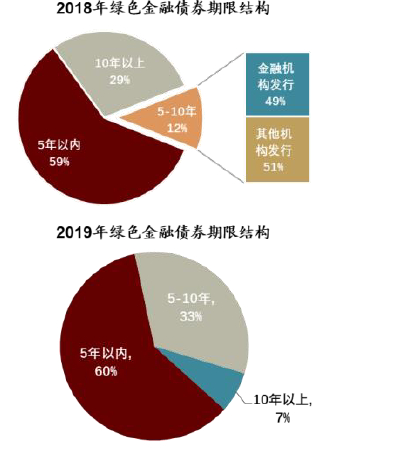 图表:2018年至2019年新发绿色债券中金融债占比显著下降,期限结构以中短期债券为主。