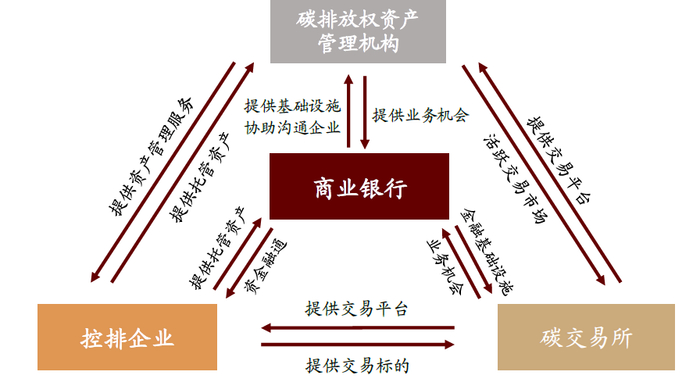 碳交易是温室气体排放权交易的统称。在排放总量控制的前提下,包括二氧化碳在内的温室气体排放权成为一种稀缺资源,从而具备了商品属性。目前国内碳排放市场事实上由商业银行、第三方碳排放资产管理机构、碳交易所、控排企业四大主体构成。商业银行在碳交易市场中的参与形式主要有三种:第一,提供金融基础设施。碳排放权交易的正常进行需要依赖商业银行的交易结算清算、资金托管等基础服务;第二,促进资金融通,具体表现为两方面:首先,商业银行能够以其雄厚资本为基础,通过提供抵(质)押贷款、碳债券等产品,为碳交易市场提供流动性支持;其次,商业银行作为金融主体,利用碳排放权这一新交易标的进行的各类金融创新,能丰富碳排放权交易模式,加速碳资产形成,提升碳排放交易市场活跃度。最后,商业银行及其理财子公司为企业客户提供碳排放交易咨询、代客理财等服务,有利于提升碳排放交易市场规范水平与专业度。