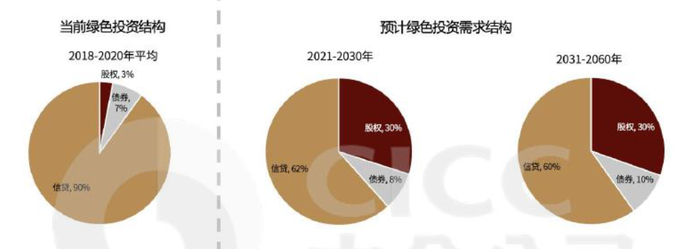 图表:假设中国企业的融资结构保持现状不变,新技术使用上市公司的融资结构,而老技术投产应用则使用信贷和债券的融资形式,我们估算“碳中和”对绿色股权和债券的投资需求仍达到总需求的40%左右