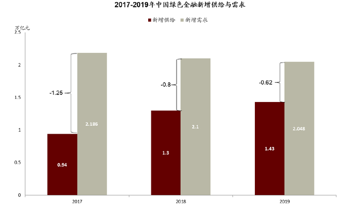 图表:尽管每年的需求缺口在缩小,但2019年绿色投资仍有6000亿元人民币的缺口