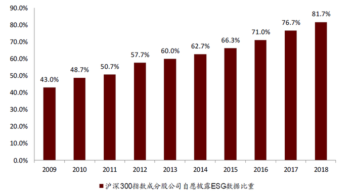 图表:沪深300指数成分股公司通过企业社会责任报告自愿披露ESG数据比重增长情况