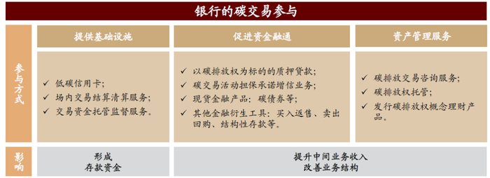商业银行积极参与碳交易相关业务,我们预计将对商业银行业务带来以下两方面影响: