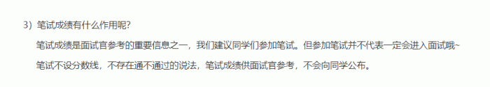 而在腾讯招聘的官网里,笔试成绩是面试官参考的重要信息之一,我们建议同学们参加笔试。但参加笔试并不代表一定会进入面试。笔试不设分数线,不存在通过不通过的说法,笔试成绩供面试官参考,不会向同学公布。