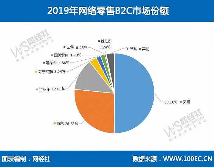 《2019年度中国网络零售市场数据监测报告》显示,2019年网络零售B2C市场,以GMV统计,天猫、京东和拼多多三强的市场占有率高达89.41%。