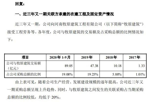 在回复深交所问询函中,牧原股份已经详细解释与牧原建筑之间关联交易的必要性及公允性,此处不再赘述,市场解读已经较为充分。2020年前三季度,牧原股份与牧原建筑的交易额占公司采购总额的19%,这一比例与2019年持平。