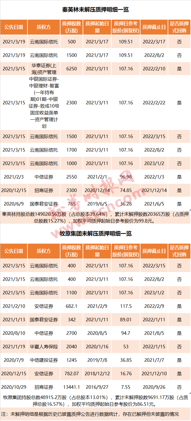 秦英林及牧原集团质押情况一览数据来源:万得