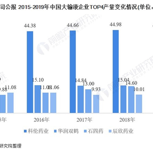 从各公司大输液产品销售量来看,2019年,科伦药业以45.17亿瓶(袋),稳居第一;石四药集团、辰欣药业分列二、三位,销量别为15.45和10.72亿瓶(袋)。