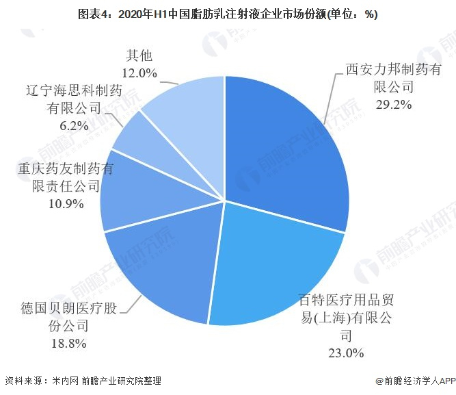 脂肪乳注射液方面,根据米内网数据显示,2020年上半年中/长链脂肪乳注射液(C8~24)及中/长链脂肪乳注射液(C8~24Ve)销售总额(终端价)为7.31亿元。其中,西安力邦制药有限公司份额排名第一,为29.16%,其次是百特医疗用品贸易(上海)有限公司,为23.00%。