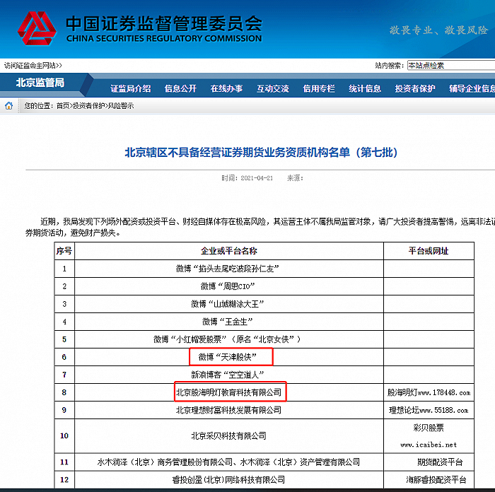 中国证监会北京监管局今日通报第七批《北京辖区不具备经营证券期货业务资质机构名单》,该名单共18个企业或平台名称,含微博“天津股侠”、微博“小红帽爱股票”、微博“王金生”、股海明灯网站等,上述微博“大V”拥有数百万粉丝。北京证监局表示,近期,发现上述场外配资或投资平台、财经自媒体存在极高风险,其运营主体不属我局监管对象,请广大投资者提高警惕,远离非法证券期货活动,避免财产损失。