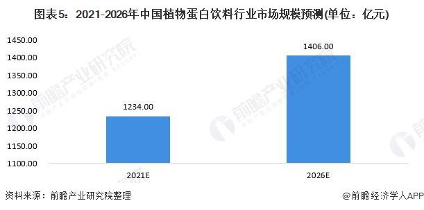 近年来,饮料行业的发展趋势已体现出人们对营养健康的诉求。前瞻产业研究院根据近几年我国植物蛋白饮料市场规模走势和植物蛋白饮料在饮料行业的渗透率情况,预测到2026年我国植物蛋白饮料市场规模超过1400亿元。