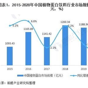 2015年到2018年我国植物蛋白饮料市场波动上上升,从2015年的1093.43亿元扩大到了2018年的1200.44亿元,但根据统计,近两年我国植物蛋白饮料市场又有所回落,2019年估计我国植物蛋白饮料行业市场规模为1188.34亿元,同比下降1%,2020年受疫情影响前瞻估计植物蛋白饮料市场规模为1117亿元,同比下降6%左右。