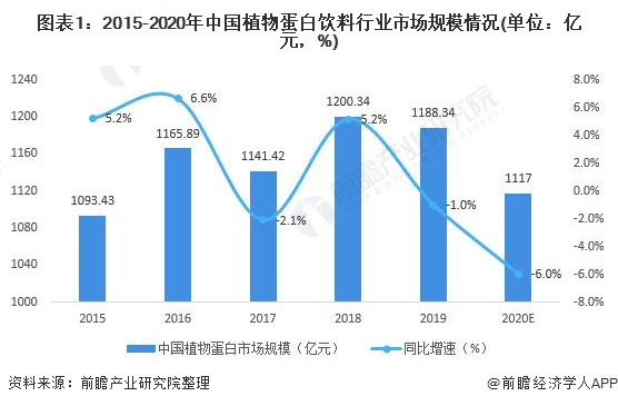 植物蛋白饮料是以一种或多种含有一定蛋白质的植物果实、种子或种仁等为原料,经加工或发酵制成的饮品,如豆奶、椰子汁、杏仁露和核桃露等。随着人们健康意识的不断提高,我国植物的蛋白饮料市场规模不断扩大,但近几年有所回落,前瞻预计2020年中国植物蛋白饮料行业市场规模受疫情影响为1117亿元,同比下降6%左右。