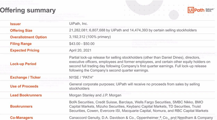 UiPath计划在本次上市中发行2369万股A类普通股,上市发行价将为每股56美元;按照这个发行价计算,UiPath的IPO估值将达到290亿美元。