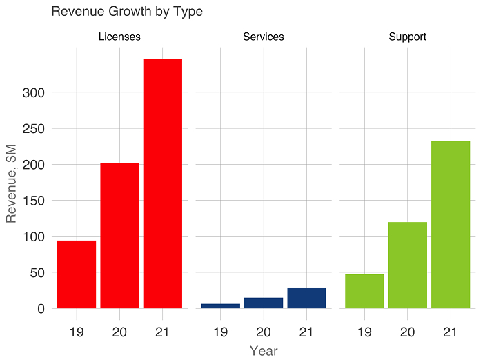 许可证收入为98%的毛利率,因为该产品在客户的计算机上运行,没有基础设施成本,生产产品的成本接近零。而支持和维护业务的毛利率为90%,比71%的SaaS公司平均水平高出近20%。