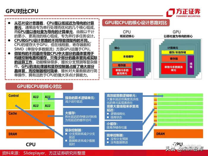 从芯片设计思路看,CPU是以低延迟为导向的计算 单元,通常由专为串行处理而优化的几个核心组成, 而GPU是以吞吐量为导向的计算单元,由数以千计 的更小、更高效的核心组成,专为并行多任务设计。CPU和GPU设计思路的不同导致微架构的不同。 CPU的缓存大于GPU,但在线程数,寄存器数和 SIMD(单指令多数据流)方面GPU远强于CPU。微架构的不同最终导致CPU中大部分的晶体管用于 构建控制电路和缓存,只有少部分的晶体管完成实际 的运算工作,功能模块很多,擅长分支预测等复杂操 作。GPU的流处理器和显存控制器占据了绝大部分 晶体管,而控制器相对简单,擅长对大量数据进行简 单操作,拥有远胜于CPU的强大浮点计算能力。