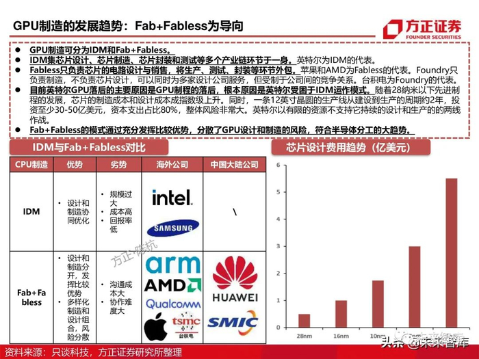 GPU的供给涉及设计、制造、封测三个主要环节,整体供给模式有IDM和Fab+Fabless两种。IDM模式将设计、制造和封测集中在一起,代表厂商有英特尔。Fab+Fabless模式的代表有AMD设计,台积电制造,通富 微电封测;ARM阵营的苹果设计,台积电制造,日月光封测。目前GPU的先进设计、先进制造主要被美系、韩系和中国台湾所控制。中国大陆企业华为和中芯国际遭到美国实体清单限制 ,未来发展艰难。封测方面,长电科技和通富微电已经掌握先进封测技术,已经有能力为苹果、AMD提供封测技术支持。