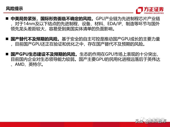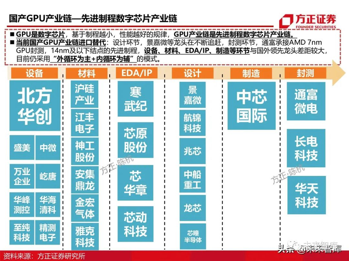 GPU被广泛地运用于PC、游戏主机、汽车、服务器、移动等领域。其中注重算力的服务器和注重便携性的移动端分别 采用独立和集成GPU,而汽车、游戏主机、PC等主要采用独立+集成的GPU接入方式。全球GPU市场表现为寡头垄断下的高增长,年复合增速超过30%,主要市场份额被英伟达等美系企业占领。在此宏观 背景下,国产GPU企业蓬勃发展,在GPU软硬件方面同时出击,呈现“星星之火,可以燎原”之GPU是数字芯片,基于制程越小,性能越好的规律,GPU产业链是先进制程数字芯片产业链。当前国产GPU产业链进口替代:设计环节,景嘉微等龙头在不断追赶,封测环节,通富承接AMD 7nm GPU封测,14nm及以下结点的先进制程,设备、材料、EDA/IP、制造等环节与国外领先龙头差距较大, 目前仍采用“外循环为主+内循环为辅式。