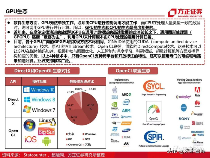 软件生态方面,GPU无法单独工作,必须由CPU进行控制调用才能工作,而CPU在处理大量类型一致的数据 时,则可调用GPU进行并行计算。所以,GPU的生态和CPU的生态是高度相关的。 近年来,在摩尔定律演进的放缓和GPU在通用计算领域的高速发展的此消彼长之下,通用图形处理器( GPGPU)逐渐“反客为主”,利用GPU来计算原本由CPU处理的通用计算任务。目前,各个GPU厂商的GPGPU的实现方法不尽相同,如NVIDIA使用的CUDA(compute unified device architecture)技术、原ATI的ATI Stream技术、Open CL联盟、微软的DirectCompute技术。这些技术可以 让GPU在媒体编码加速、视频补帧与画面优化、人工智能与深度学习、科研领域、超级计算机等方面发挥异 构加速的优势。以上4种技术中,只有OpenCL支持跨平台和开放标注的特性,还可以使用专门的可编程电路 来加速计算,业界支持非常广泛。