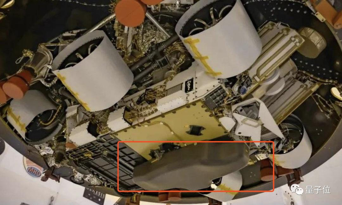 首先是去火星,机智号被连接在火星车腹部,外部还罩了一个保护层。