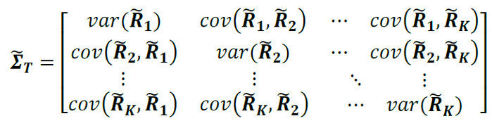对于资产k,我们可以计算n个T日收益率的预测值{R1_k, R2_k, ... , Rn_k},该结果近似代表了资产k未来T日收益率的后验分布R~_k。最后,基于各资产的T日收益率后验分布,容易估计未来T日的资产协方差矩阵: