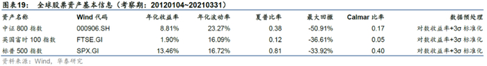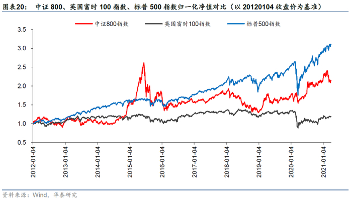 实验组四:将多资产组成改成中证800指数、英国富时100指数、标普500指数,开展全球股票资产配置。各资产基本信息及其自2012年以来的走势详见图表19和图表20。