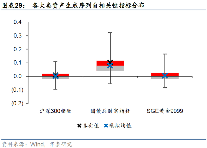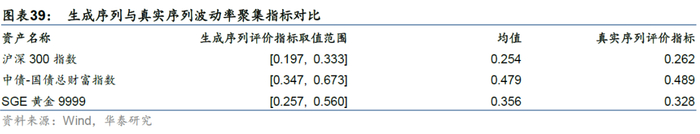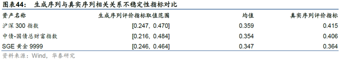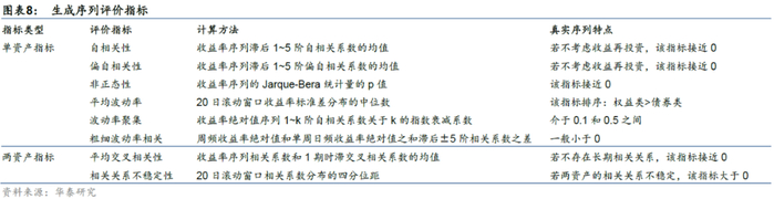 同时,本研究更关注风险,所以本文的评价指标体系在前期报告的基础上,增加了衡量资产收益率波动和多资产相关关系的指标,详见图表8。从多样性的角度来说,不同随机数序列生成的虚假序列的评价指标应具有一定的差异性;从真实性的角度来说,真实序列的评价指标应在n组生成序列评价指标构成的区间内,且尽可能地接近区间均值。
