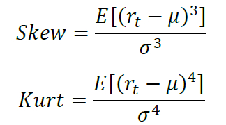 对于真实序列而言,资产收益率通常不服从正态分布,一是呈现厚尾,二是呈现右偏,这是因为“黑天鹅”事件发生的频率更高。不过,由于随机数序列出现重大利好环境和出现重大利空环境的概率是相等的,因此我们对生成序列的要求从右偏放宽到有偏。其中,厚尾可用峰度(kurtosis)评价,有偏可用偏度(skewness)评价。Jarque-Bera统计量同时考虑了峰度和偏度,我们据此构建非正态性指标。首先,偏度和峰度计算公式如下: