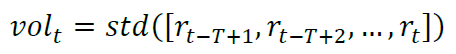 取窗口宽度等于生成序列长度T,移动步长取1,将移动窗口作用于全收益率序列,得到一系列长度为T的收益率子序列,并计算各子序列的标准差: